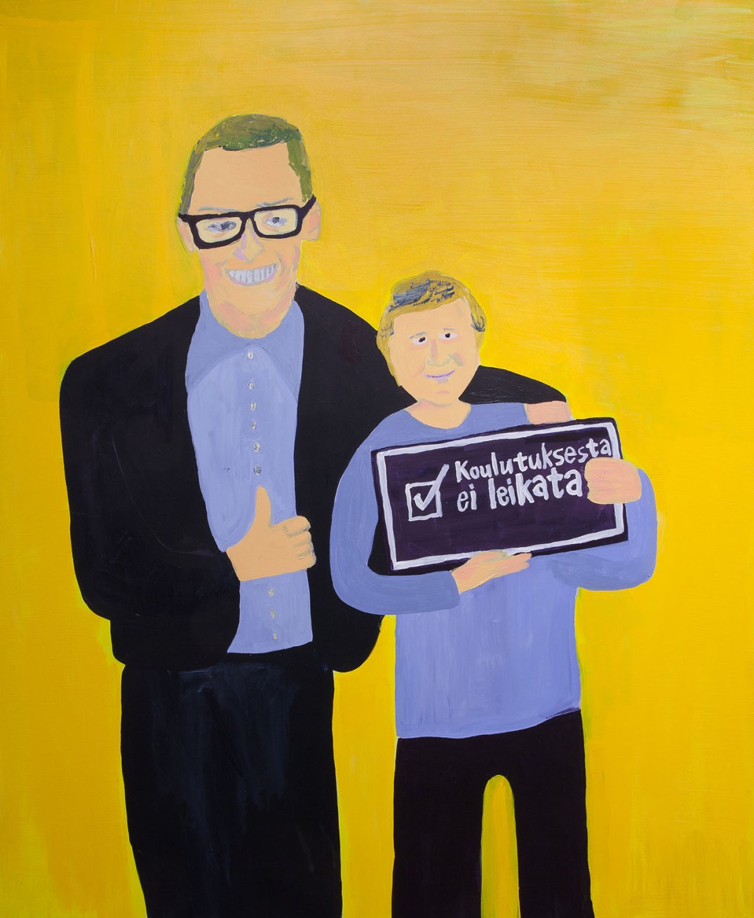 In the acrylic painting serie Up in the Ass of Timo (and other meme paintings) the rapid and ephemaral essence of the internet memes is been captured by painting. I was interested of the paradoxical clash of approaching the new untamed visual environment of internet with the traditional,slow and concrete medium. One of my aims by painting the memes was to slow down the numbing visual overflow of our surroundings into a static, concrete and sustainable form.